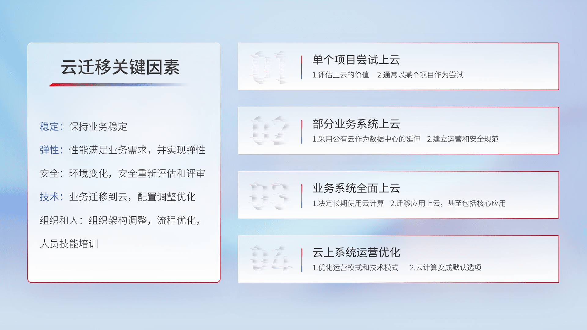 结合实际业务,,从规划设计、、、云平台选型、、、云原生改造、、数据迁移、、、、集成交付,,,迁移全过程为客户识别最佳上云路径,,做好风险识别管理,,,设计网络架构、、身份权限、、安全审计合规、、、操作审计、、、、日志审计、、、、监控告警策略、、、、多站点容灾设计等,,,对云上基础设施进行整体规划,,,,提升IT治理水平,,以满足弹性、、、高可用、、、高性能的需求。。。。
